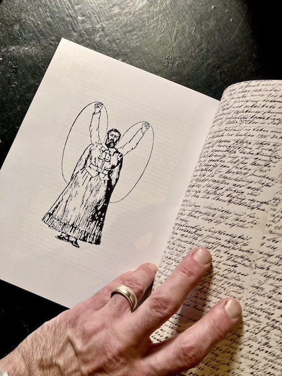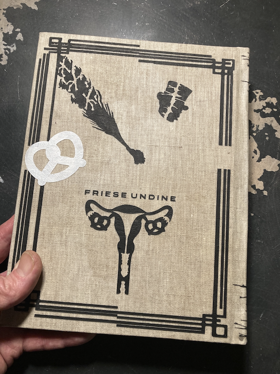 Handmade linen book cloth, hand-printed cover graphics, acrylic on muslin end-papers, printed matter.