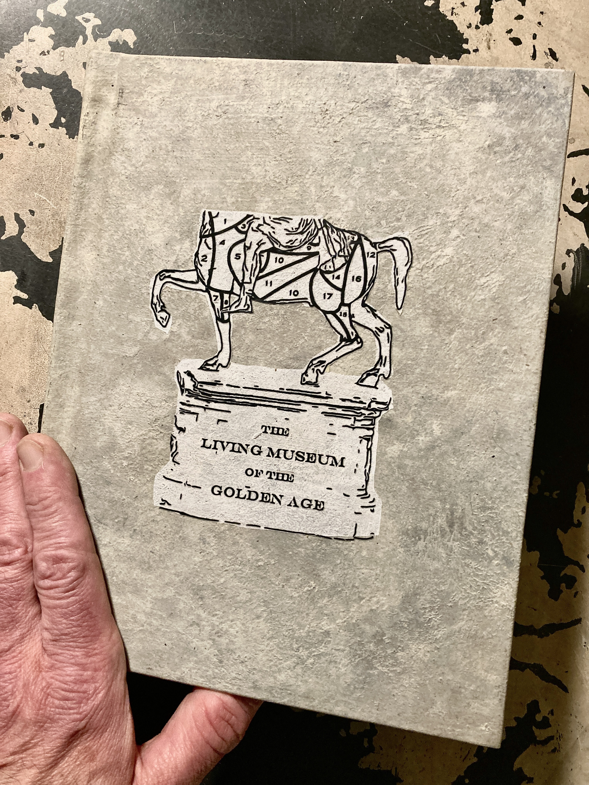 Handmade book cloth, hand-printed cover graphics, acrylic on muslin end-papers, printed matter.
