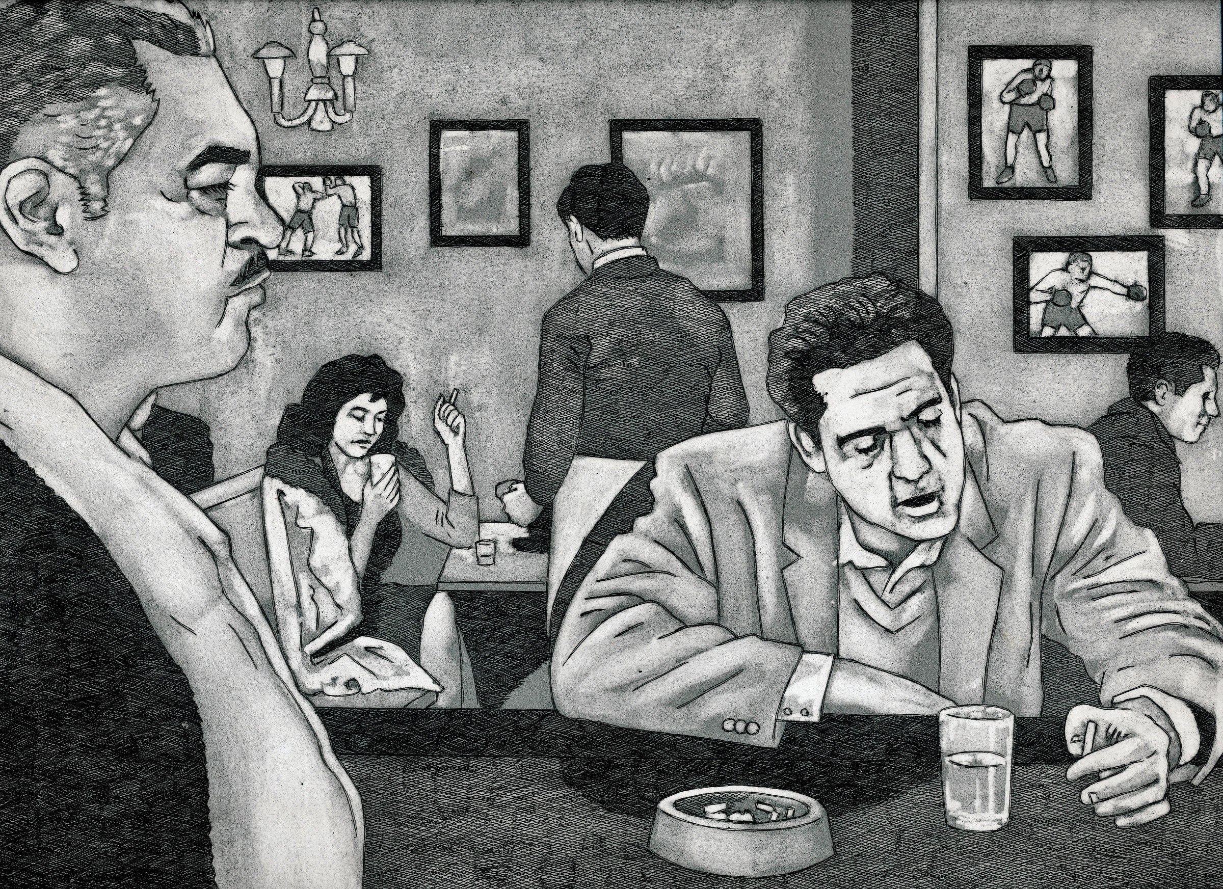 A Bartender and a Man in a Bar, a Woman, a Waiter and Another Man Behind Them,