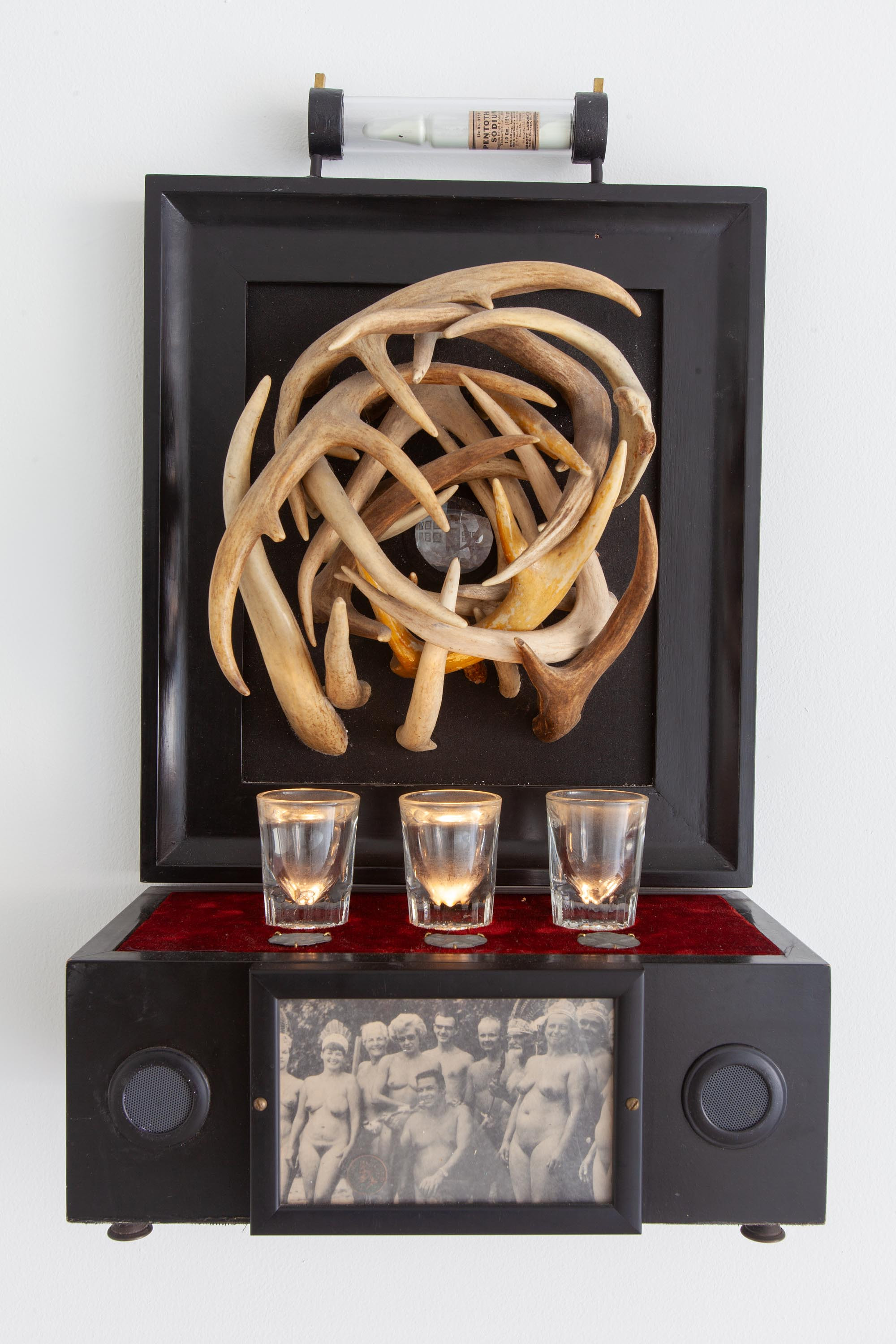 Deer antlers, shot-glasses, framed clipping from a nudist's magazine, Native American arrowhead, magnifying lens, speakers and audio playing device.