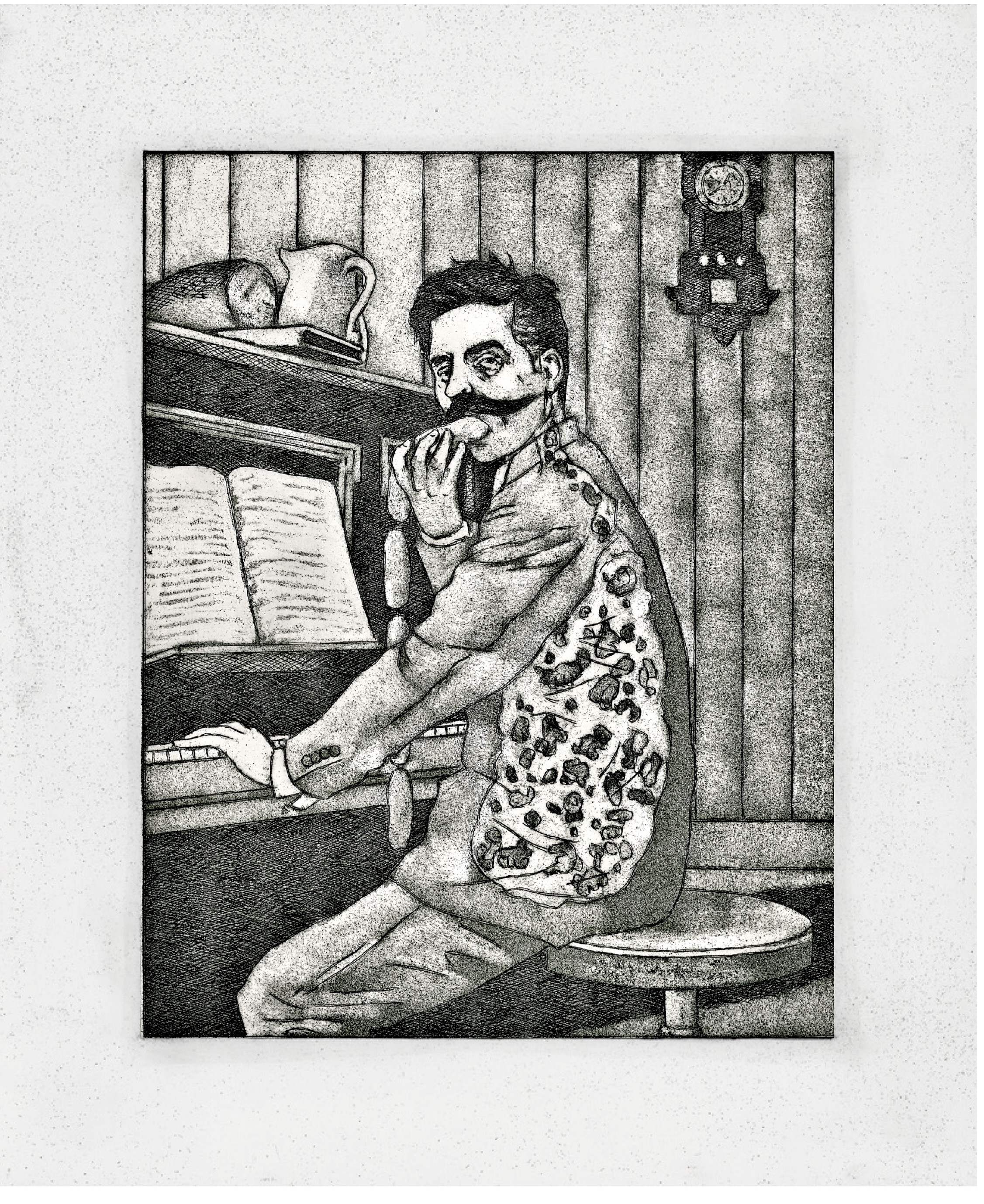 Page 133. “I existed frequently without a stomach.” Page 134. “Food and drink taken simply poured into the abdominal cavity and into the thighs…” Page 160. “While I ate alone I had almost regularly to play the piano…”